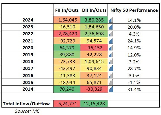 The table below highlights the contrasting flows between FIIs and DIIs over the last decade: